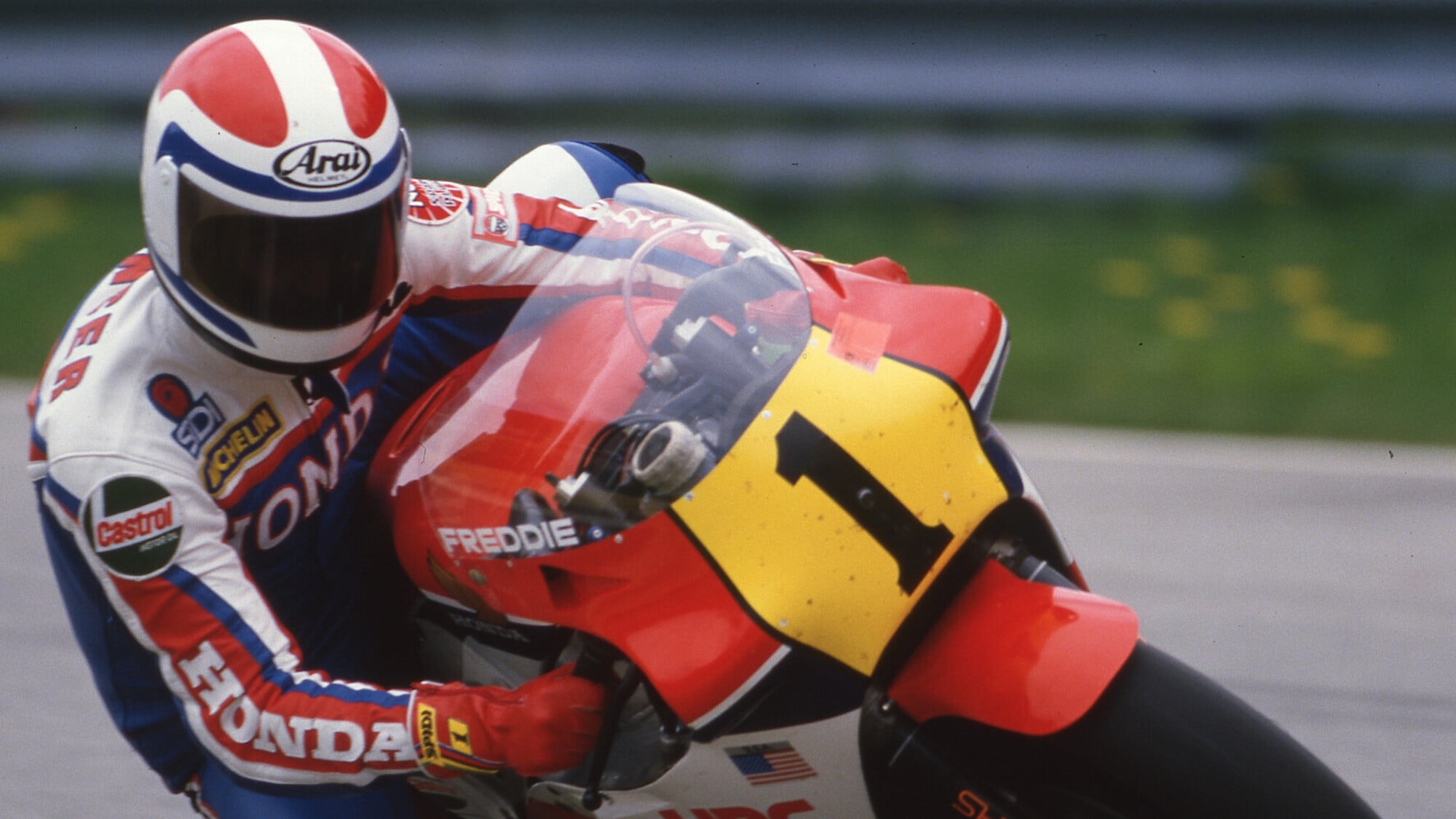 Ancora più impressionante lo squadrone che gli USA presentarono nel weekend di Pasqua del 1984, con i primi quattro del Mondiale 500 dell’anno precedente: Roberts ed Eddie Lawson con le Yamaha TZR 500, Wayne Rainey con la TZ 500, Spencer (nella foto di copertina) e Mamola con le Honda NS 500, Mike Baldwin e Wes Cooley con le Honda RS 500: la versione motociclistica del Brasile calcistico del 1970 che schierava cinque numeri 10 guidati da Pelè. Nove le gare corse, a Donington, ma Rainey le saltò per un infortunio in prova mentre Spencer cadde dopo aver vinto due manche fratturandosi entrambi i piedi. Anche Ron Haslam finì a terra e così la Honda vietò ai suoi piloti le gare extra-calendario.