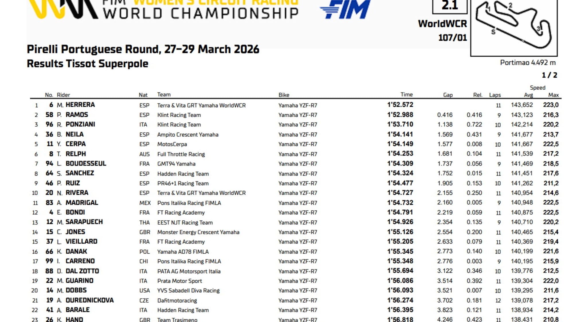 Non ha lasciato chance a nessuna, Maria Herrera si è imposta in Superpole fermando il cono in 1’52”572, siglando il nuovo record della pista di Portimao. La spagnola ha firmato il record della pista già al primo passaggio, scendo per prima sotto il muro del 1’53”. “Il cambio di Team mi ha dato più confidenza e consapevolezza – ha raccontato al termine della Superpole -, dobbiamo però continuare a crescere perché Paola sarà velocissima anche in gara”. Alle spalle della Campionessa del Mondo c’è infatti la rookie Paola Ramos sulla moto del Team Klimt Forward lasciata in inverno proprio da Maria. La diciottenne nativa di Tarragona si è fermata a quattro decimi dalla rivale, ma dopo l’incredibile weekend di debutto a Jerez lo scorso anno vuole dimostrare di poter lottare per la vittoria anche a Portimao. Completa la prima fila Roberta Ponziani, l’abruzzese è riuscita nel finale di turno a salire in terza posizione fermando il crono in 1’53”710. Roberta e Beatriz Neila, quarta a quattro decimi dall’italiana dovranno provare a rallentare le prime due della classe se vorranno mantenere una chance di vittoria negli undici giri delle due Gare in programma domani e domenica. Seconda fila completata dalla wildcard Yvonne Cerpa e Tayla Collins (l’australiana si è recentemente sposata cambiando il proprio cognome da Relph a quello del marito). In terza fila Lucie Boudesseul, la francese ha preceduto di pochi millesimi Sara Sanchez con Pakita Ruiz nona. Top 10 chiusa da Natalia Rivera che incassa due secondi dalla compagna di squadra e scatterà in quarta fila accanto a Astrid Madrigal e Emily Bondi. Diciottesima posizione per Denise Dal Zotto, alle sue spalle la Campionessa Italiana Martina Guarino mentre ha chiuso in ventiduesima posizione Arianna Barale.