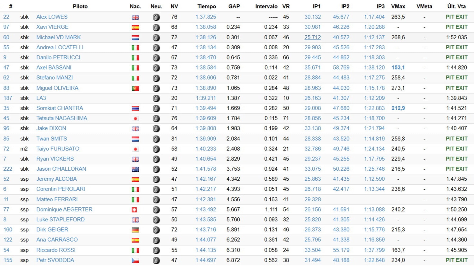 In Supersport il miglior tempo è stato fatto registrare da Jeremy Alcoba – protagonista anche di una caduta a mezz’ora dalla fine della giornata che ha causato una breve bandiera rossa – con la Kawasaki Ninja ZX-6R del Team Puccetti Racing. Seconda posizione per Corentin Perolari con la Honda CBR600RR e Matteo Ferrari terzo con la Ducati Panigale V2 del Team WRP.