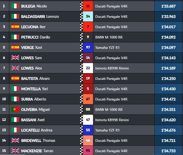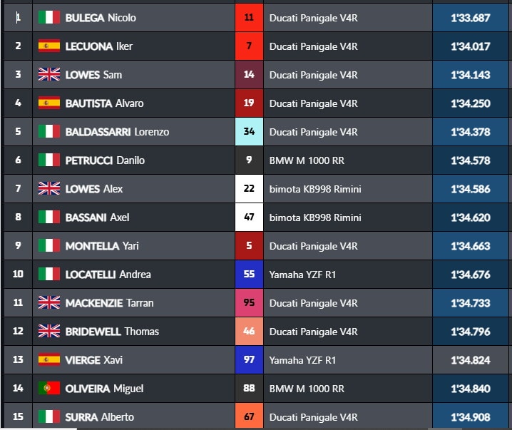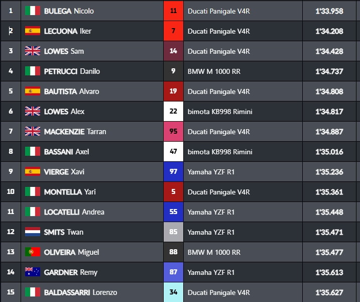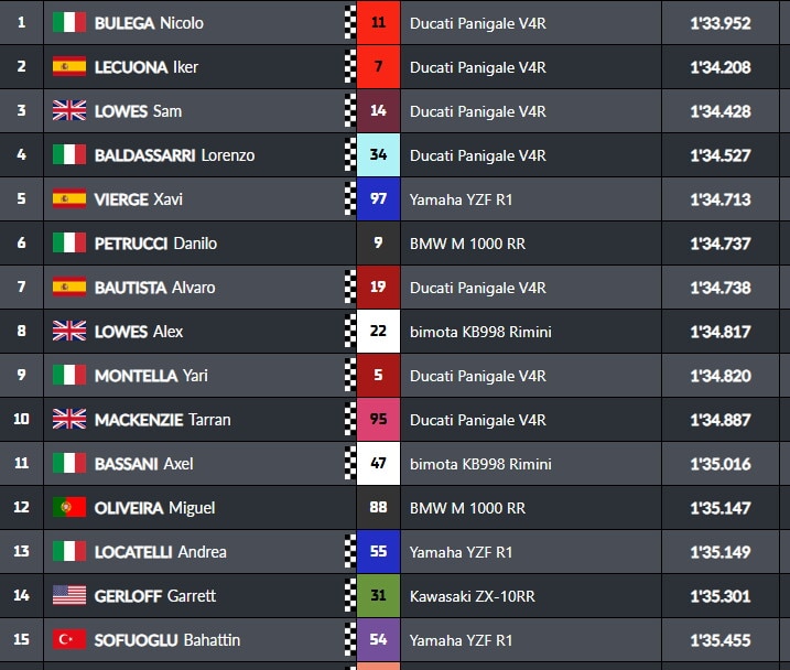 L'italiano del team Aruba.it Ducati si mette in prima posizione segnando un miglior tempo in 1:34.232. Ottimo anche il passaggio di Lecuona che si prende la quarta casella a +0.630 dal leader. Chiude la top 5 Bautista