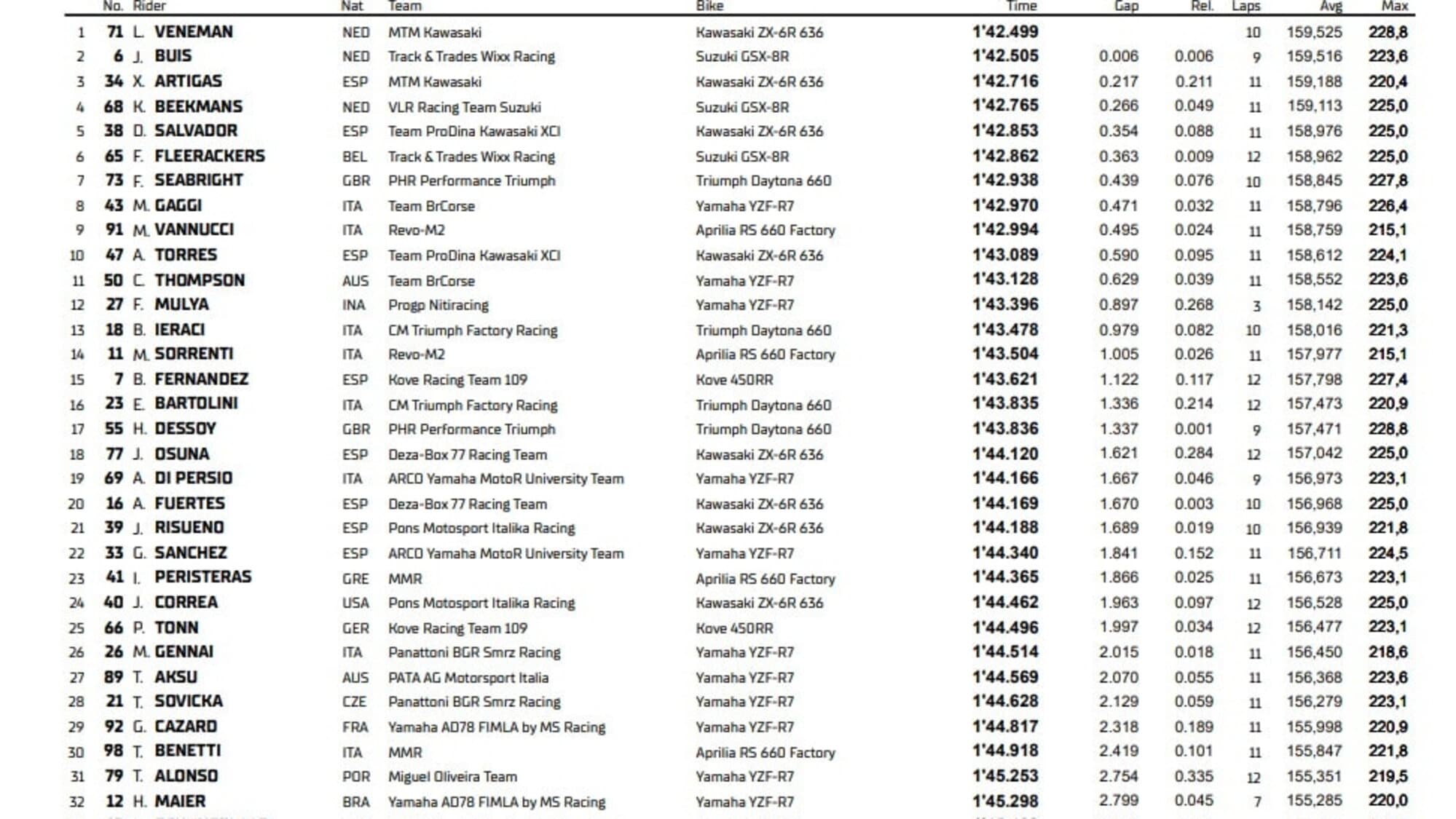 Prosegue l’equilibrio visto nel round d’apertura della stagione a Portimao in Sportbike. Kawasaki e Suzuki si spartiscono le prime sei posizioni, dominate però dai colori olandesi con ben tre padroni di casa nei primi quattro posti e l’inserimento di Xavi Artigas (Team MTM Kawasaki) e del belga Ferre Fleerackers in sesta piazza. A firmare la pole è stato Loris Veneman, già migliore di tutti in FP1, fermando il cronometro in 1’42”499, solo sei millesimi meglio dell’altro olandese Jeffrey Buis sulla GSX-8R del Team Track & Trades Wixx Racing. A completare la prima fila è il compagno di squdra di Veneman, Xavi Artigas che ha sfruttato al meglio il traino dell’olandese per conquistare il terzo tempo a 217 millesimi dal compagno/rivale. Seconda fila per il terzo olandese della griglia ovvero Kas Beekman, sempre su Suzuki, 49 millesimi più lento dello spagnolo. A completare la seconda fila un'altra coppia di Kawasaki e Suzuki formata da David Salvador e Fleerackers. In terza fila invece cambiano moto e bandiere con l’inglese Fenton Seabright sulla Triumph Daytona 660 a 439 milleismi da Veneman a precedere i due italiani Marco Gaggi (Yamaha BR Corse) e Matteo Vannucci (Aprilia Revo-M2) separati da pochi millesimi. Solo decimo il leader di campionato Antonio Torres con la quarta delle Ninja in classifica a precedere altre due Yamaha (molto più competitiva ad Assen rispetto a Portimao) quelle di Carter Thompson e Felix Mulya il cui turno dopo esser iniziato in ritardo è anche finito anzitempo per un contatto che ha porato alla caduta e all’incendio della sua R7. Tredicesimo Bruno Ieraci (Triumph CM Racing) a precedere Mattia Sorrenti (Aprilia Revo-M2) mentre è sedicesimo Elia Bartolini (Triumh CM Racing) alle spalle del Campione del Mondo SSP300 in carica Benat Fernandez con la Kove.