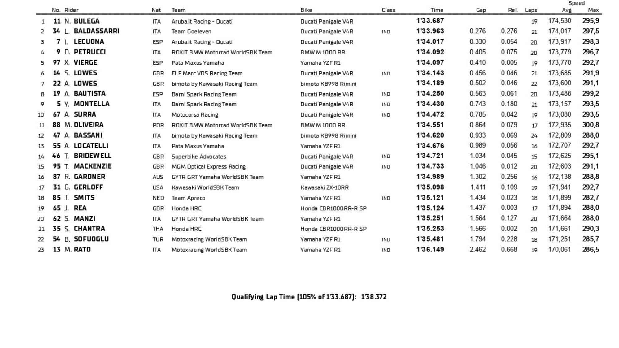 Ma bravo Xavi Vierge, unico a spostare un po' in alto la Yamaha. Le altre R1 faticano. Eppure, qui Andrea Locatelli ci vinse nel 2025. Bimota leggermente meno incisiva rispetto ad Australia e Portogallo, ricordandone la "punizione" inflittale ieri. Alex Lowes e Axel Bassani duellano appena dietro la top five.