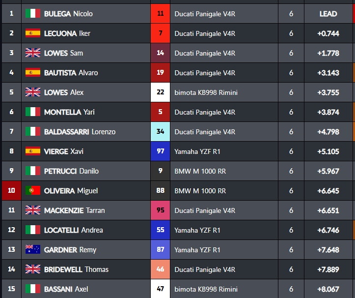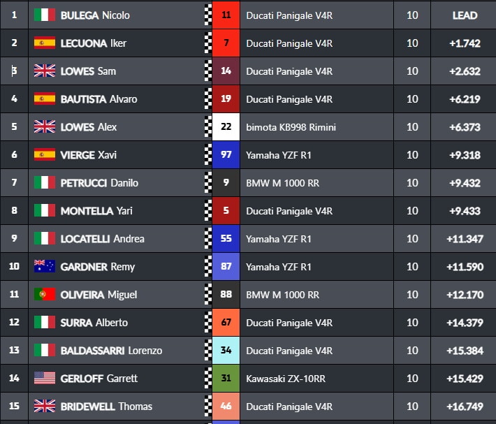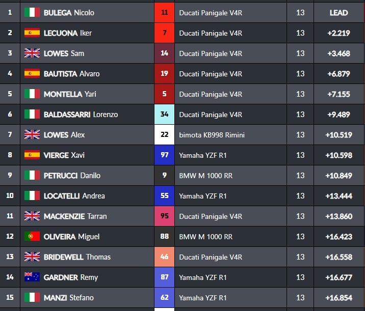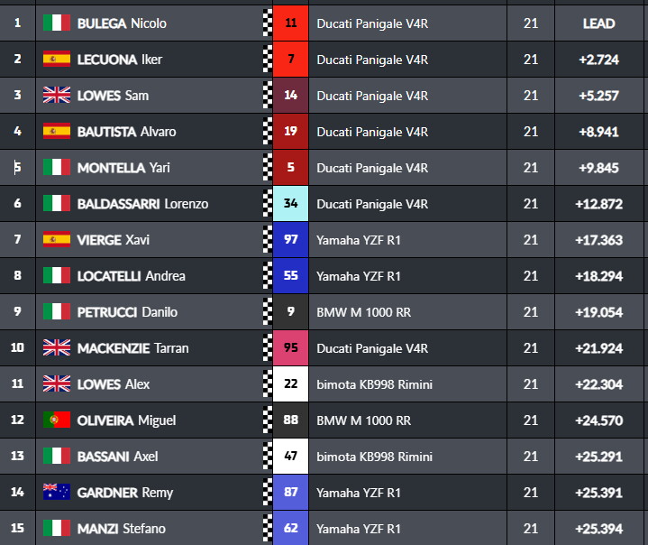SBK, 15 giri alla bandiera a scacchi, la classifica LIVE