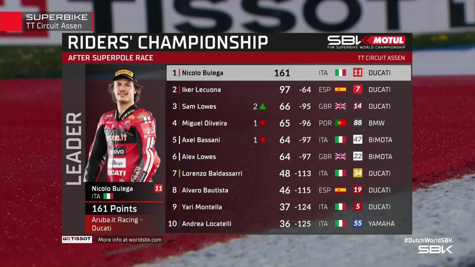 Il pilota Aruba.it Ducati si conferma anche questa mattina come il miglore nei 10 giri sulla pista di Assen. Sono 8 vittorie su 8 gare per lui. Secondo Lecuona a +1.742. 3° Sam Lowes a +2.632 dalla testa. Bautista chiude quarto e Alex Lowes quinto