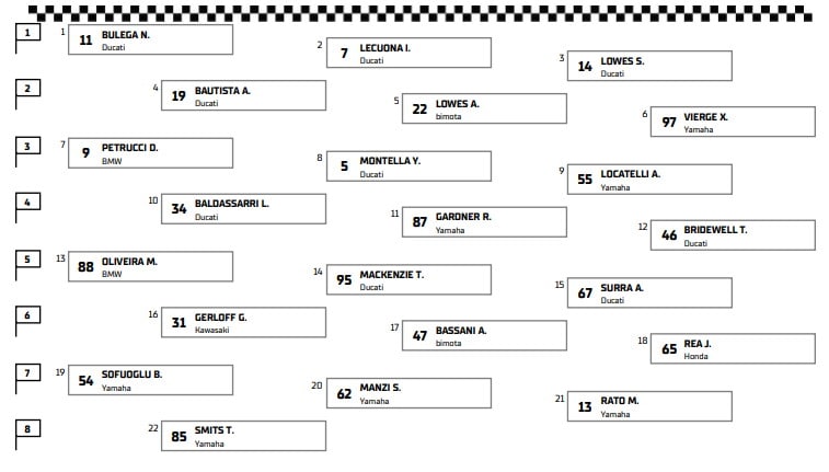 La griglia di partenza vede in pole Bulega seguito da Sam Lowes e Lecuona terzo. Petrucci e Locatelli chiudono la top 5