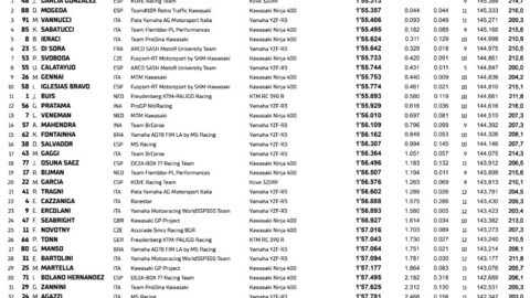 Ottima qualifica anche per Kevin Sabatucci e Bruno Ieraci, rispettivamente quarto e quinto con le Kawasaki Ninja 400 dei team Flembbo e ProDina, ma nelle prime dieci posizioni troviamo anche un buon Mirko Gennai, nono con la Ninja 400 del Team MTM. Prima Superpole con KTM più difficile del previsto per il campione del mondo in carica Jeffrey Buis, undicesimo con anche uno spettacolare salvataggio nei minuti conclusivi.