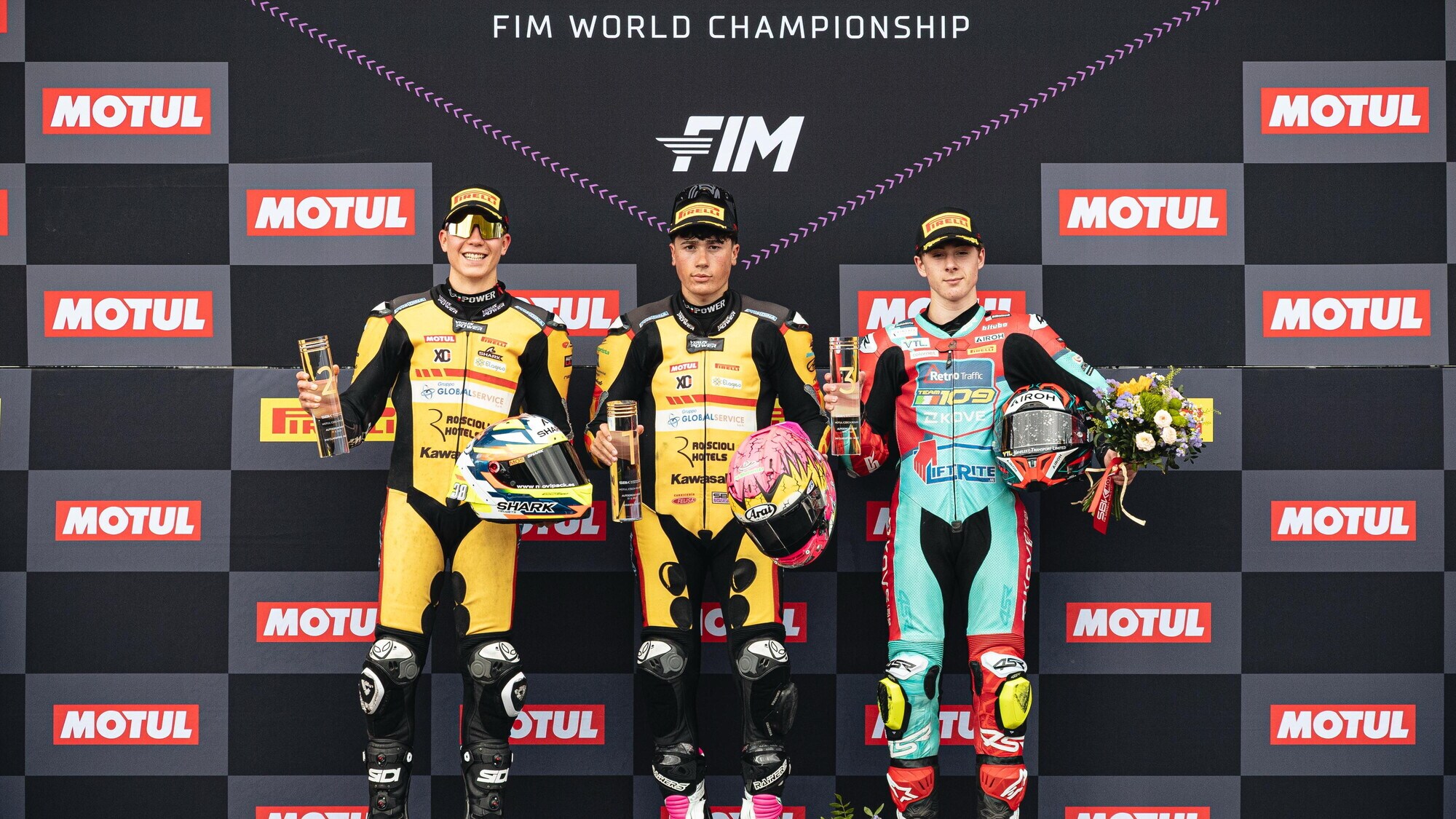 Una gara caotica con continui cambi di posizioni, come spesso accade in SSP300, a spuntarla dopo una gara sempre di testa è stato Julio Garcia che ha beffato in volata il compagno si squadra David Salvador scattato dall’ultima fila a causa di una penalità in Superpole. La coppia Prodina festeggia davanti a Benat Fernandez, il rookie ha portato nuovamente la Kove 321 RR-S sul podio precedendo il poleman Humberto Maier primo dei piloti Yamaha a precedere Matteo Vannucci ed Elia Bartolini. Vannucci è arrivato a comandare anche la gara a qualche giro dal termine prima di venire riassorbito dal gioco delle scie poche curve più tardi. Top10 anche per Marco Gaggi, ottavo alle spalle di Antonio Torres con il padrone di casa Petr Svoboda a chiudere una top10 racchiusa in soli 9 decimi.
