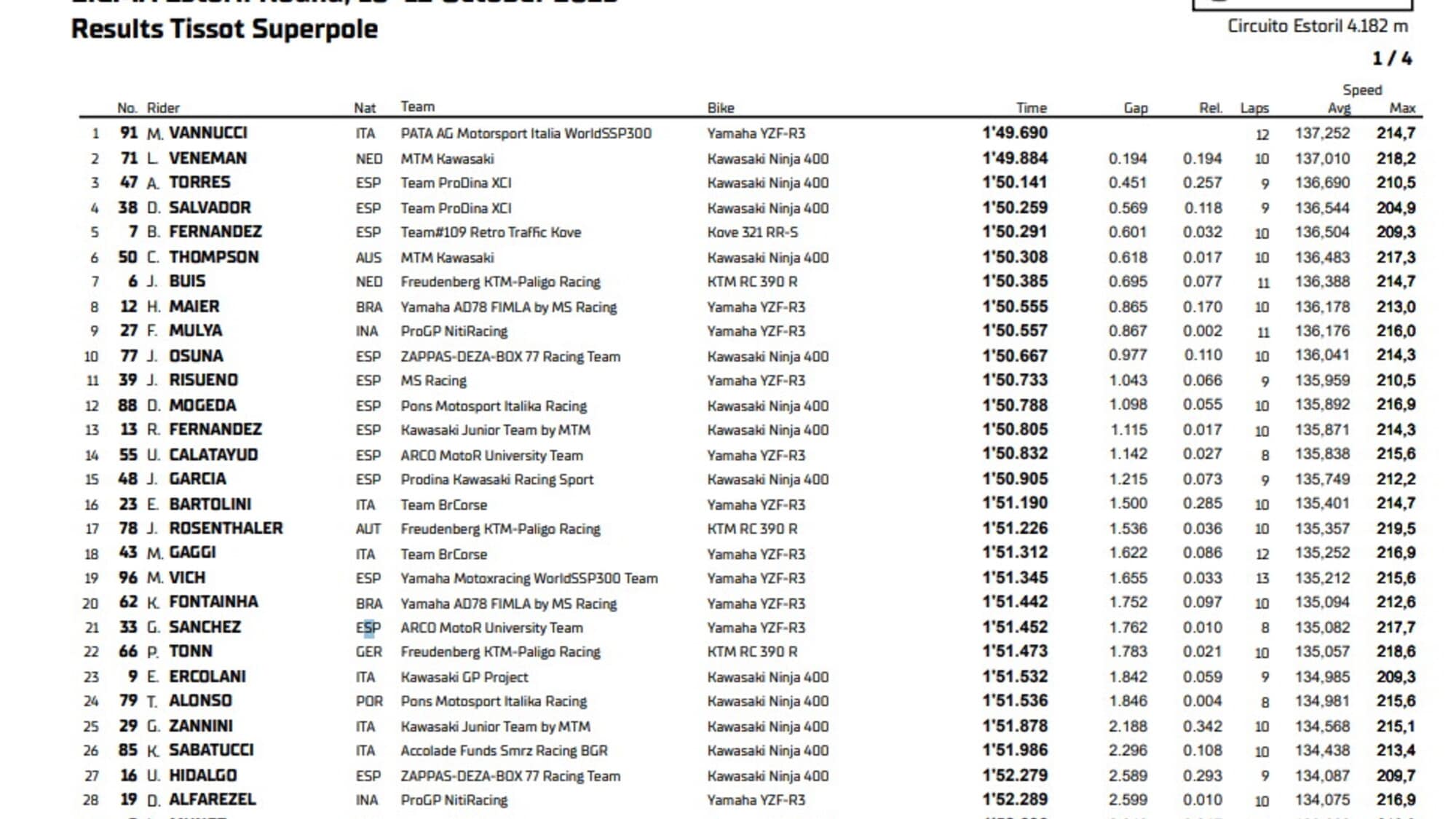 È un Matteo Vannucci ritrovato quello che da Magny-Cours si è ripreso con prepotenza la scena del mondiale SSP300. Dopo aver fatto sua la pole ad Aragon, anche a Estoril il toscano del Team AG Motorsport ha fatto segnare il miglior passaggio in Superpole, fermando il cronometro in 1’49”690. A impressionare è stato il ritmo del pilota Yamaha che per tutto il turno ha girato completamente da solo senza mai pagare in termini di tempo rispetto ai rivali che hanno girato in gruppo. Sono 194 i millesimi inflitti a Loris Veneman, secondo dopo esser tornato sulla Ninja 400 del Team MTM Kawasaki da qualche round dopo aver iniziato la stagione in Supersport. A chiudere la prima fila Antonio Torres con la Ninja del Team Prodina che incassa però già 451 millesimi. Dalla seconda fila in poi i distacchi superano tutti il mezzo secondo: quarto, quinto e sesto i tre principali protagonisti del campionato con David Salvador a precedere il leader di campionato Benat Fernandez e Carter Thompson. Terza fila per Jeffrey Buis che incassa sei decimi da Vannucci, davanti al brasiliano Humberto Maier e l’indonesiano Felix Mulya.