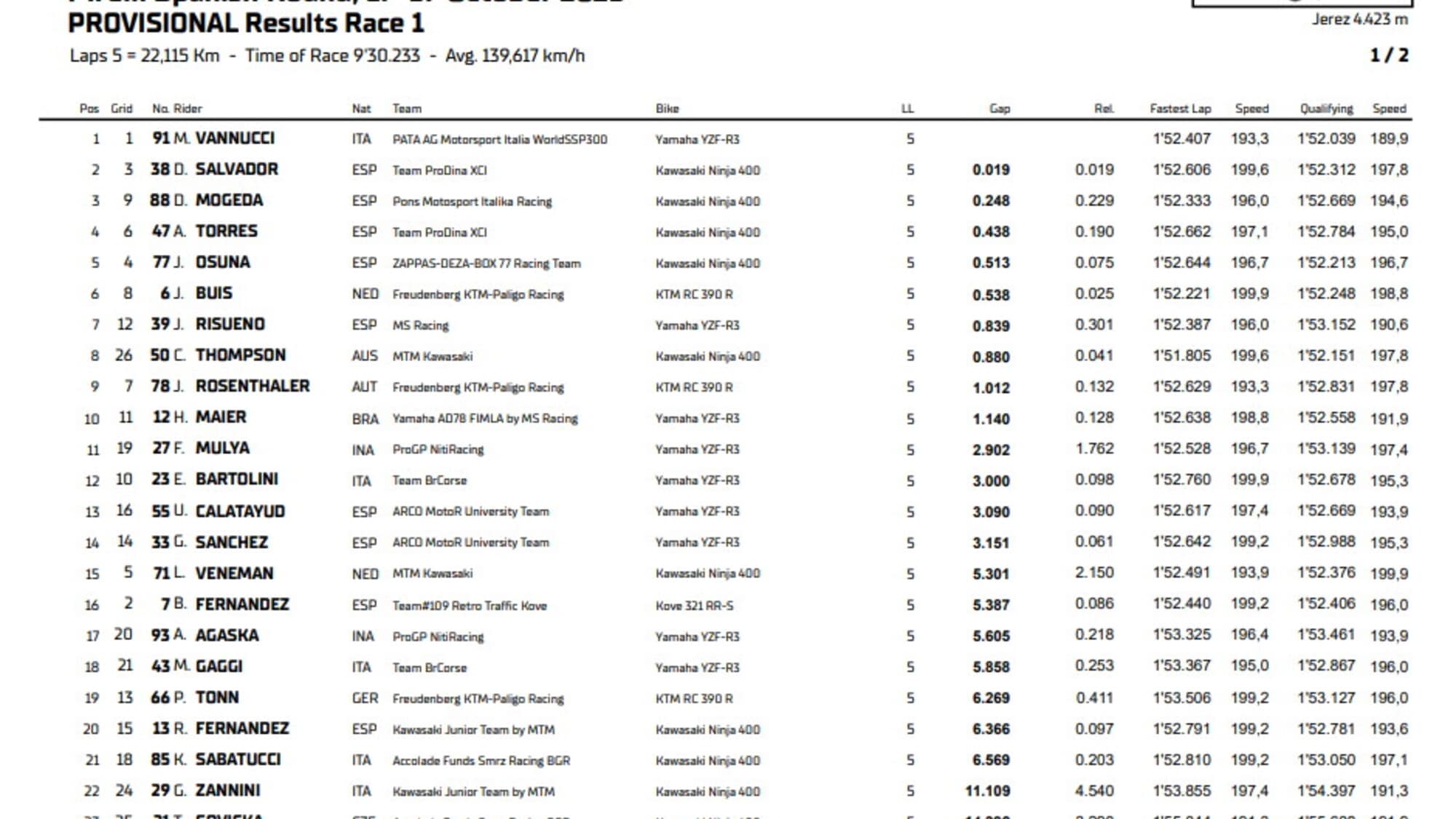 Al restart Matteo Vannucci ha fatto valere la sua velocità, dimostrata già ieri in Superpole, prendendo la testa della gara e vincendo lo sprint finale con David Salvador per soli 19 millesimi. Lo spagnolo nonostante il secondo posto torna prepotentemente in corsa per il titolo grazie allo zero di Benat Fernandez finito largo in Curva 1 all’ultimo giro e rientrato solo in sedicesima posizione. Sul podio con Vannucci e Salvador è salito Daniel Mogeda. Quarta posizione per Antonio Torres davanti a José Osuna e Jeffrey Buis. Settima posizione per Juan Risueno davanti a Carter Thompson, l’australiano non ha potuto sfruttare a pieno il passo falso di Fernandez perché è scattato dall’ultima posizione dopo esser caduto nella prima partenza. A punti anche Elia Bartolini dodicesimo e Loris Veneman quindicesimo dopo il lungo con Fernandez nell’ultimo passaggio.