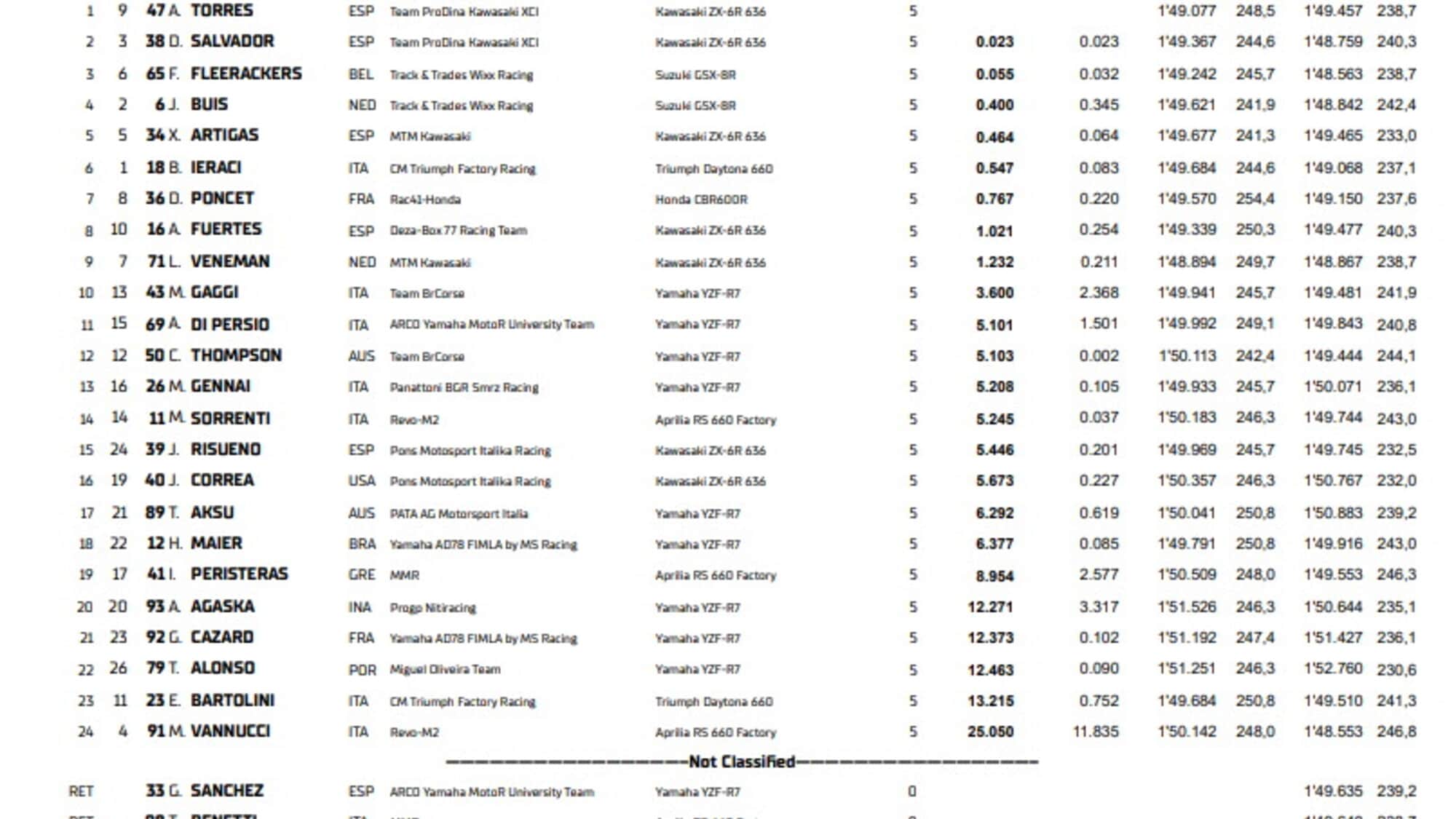 Non sono mancati i colpi di scena nella prima gara iridata della neonata classe Sportbike. Una gara in due parti con la bandiera rossa che è stata esposta nel corso del sesto passaggio a causa dell’olio presente in Curva 1 che ha causato le cadute di Dessoy, Osuna, Mulya e Sovicka. Dopo la ripartenza Matteo Vannucci che era stato a lungo in testa nei primi passaggi è scivolato in Curva 5, lo stesso destino è capitato pochi metri più avanti a Elia Bartolini, risalito fino alla seconda posizione dopo il restart. Le speranze italiane nella breve “gara 2” sono state così raccolte da Bruno Ieraci, sesto sotto la bandiera a scacchi. Davanti i duelli sono stati tutti “in casa” il Team Prodina si è spartito il duello per il successo con Antonio Torres che ha conquistato la sua prima vittoria nel Mondiale dopo averla solo sfiorata lo scorso anno in SSP300. Alle sue spalle il compagno David Salvador, la lotta per il terzo posto è stata invece un affare Suzuki con Ferre Fleerackers a precedere in volata il due volte Campione del Mondo Jeffrey Buis. Quinta posizione per l’espertissimo Xavi Artigas con la Ninja del Team MTM Kawasaki mentre ha chiuso al settimo posto Diego Pochet con la Honda CBR600RR. Ottavo posto per Alvaro Fuertes a precedere Loris Veneman e Marco Gaggi, miglior Yamaha al decimo posto. Alle sue spalle un gruppo folto di R7 composto da Alessandro Di Persio, Carter Thompson e Mirko Gennai. Primi punti iridati anche per Mattia Sorrenti con l’Aprilia del Team Revo-M2 quattordicesimo.