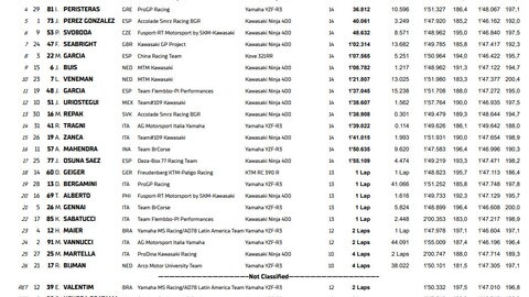 Anche la quarta posizione del greco Ioannis Peristeras scattato dalla ventinovesima posizione premia la scelta coraggiosa di restare con le slick su una pista che in diversi punti era arrivata ad essere veramente in condizioni difficili. Quinta posizione per il poleman Josè Luis Perez Gonzalez, primo dei piloti con le rain al traguardo con le rain, lo spagnolo è stato tra i primi a rientrare ai box gli ha permesso di sfruttare meglio le condizioni difficili dei primi giri. L’eroe di casa Petr Svoboda chiude sesto recuperando dal fondo della classifica a causa del contatto di inizio gara. Ottima prestazione anche dell’inglese Fenton Seabright che in queste condizioni è riuscito a mettere in scena una delle sue migliori gare in carriera. Ottava piazza per Marc Garcia con la Kove a precedere Jeffrey Buis e Loris Veneman.