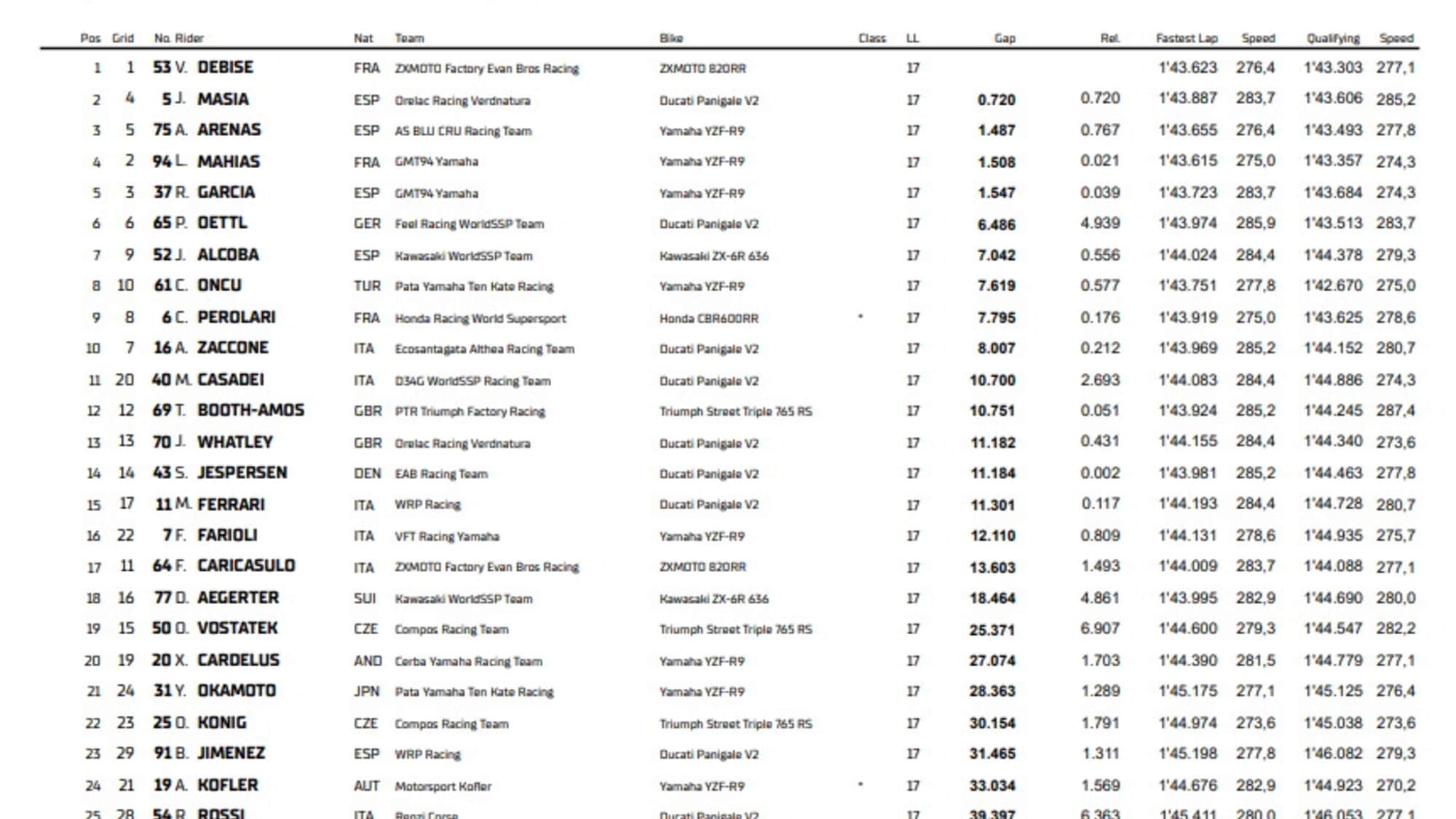 Weekend indimenticabile per Valentin Debise, il francese centra la sua prima doppietta nel Mondiale SSP, regalando al Team Evan Bros e a ZXMOTO il bis dopo la vittoria del sabato. Sul podio al termine di un’incredibile battaglia negli ultimi giri Jaume Masia e Albert Arenas.